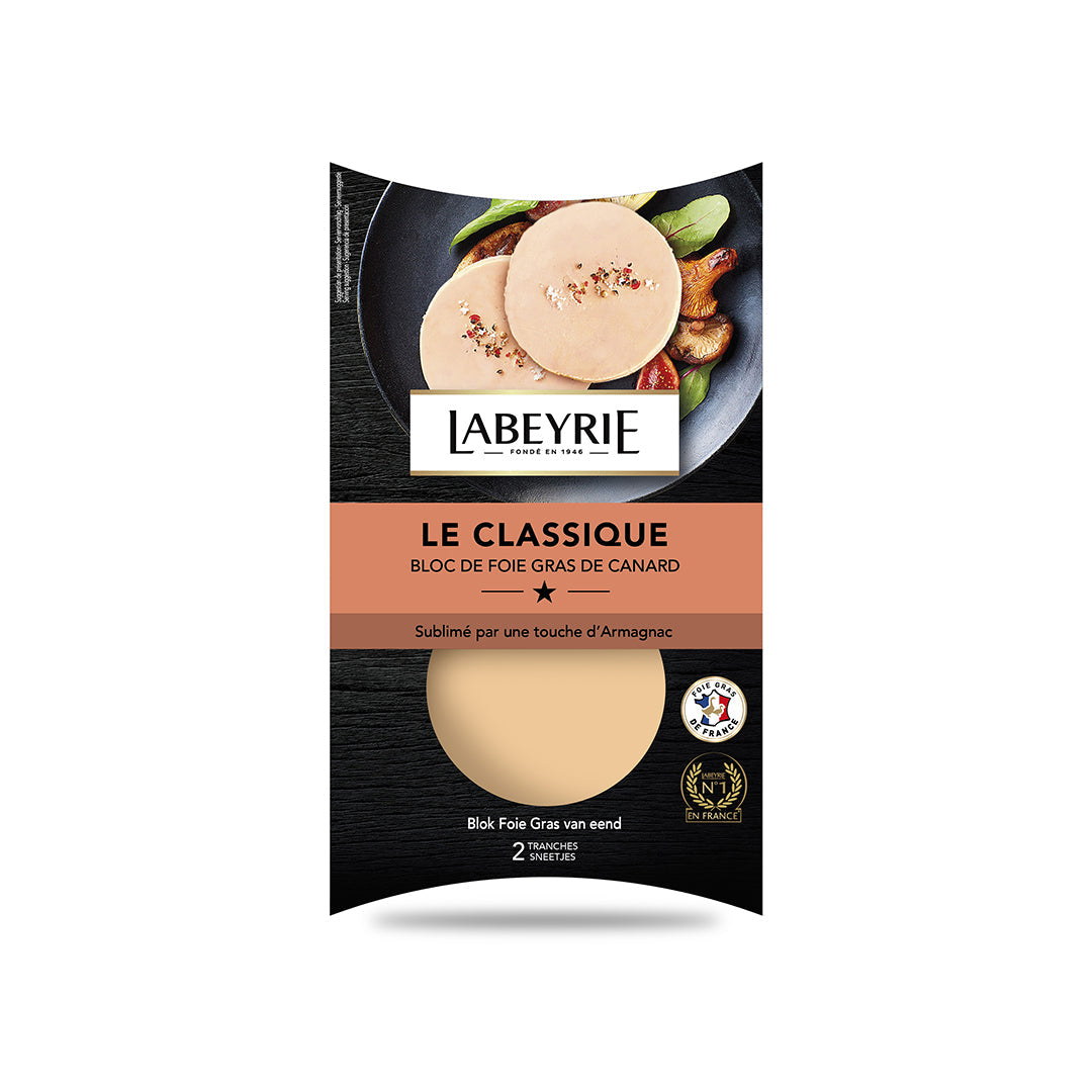 Bloc de foie gras de canard le duo features two 40g slices of duck foie gras, delicately flavored with armagnac