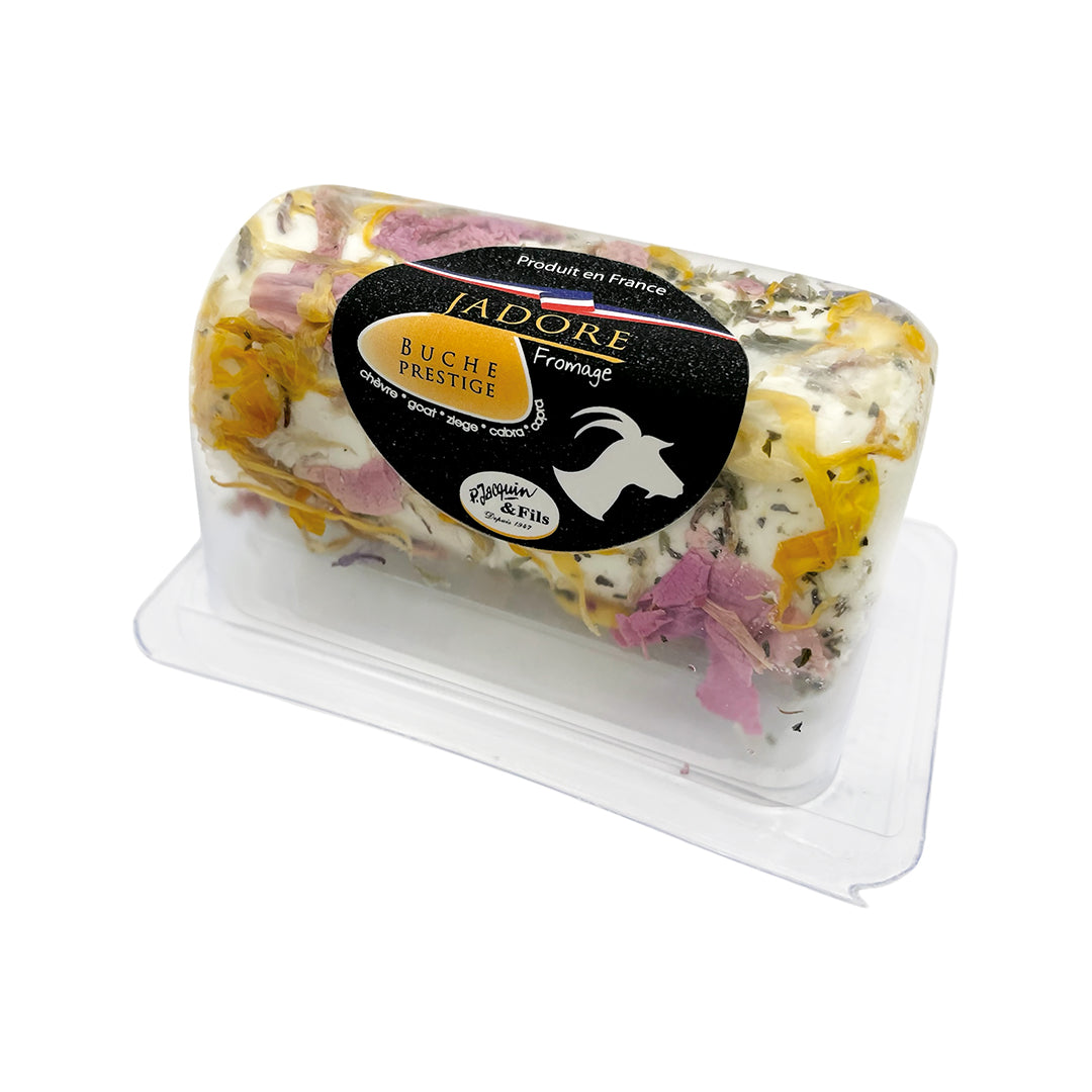 A small log of fresh goat cheese, delicate and floral, with a thin natural rind. Creamy and balanced, perfect for salads or refined cheese platters.
