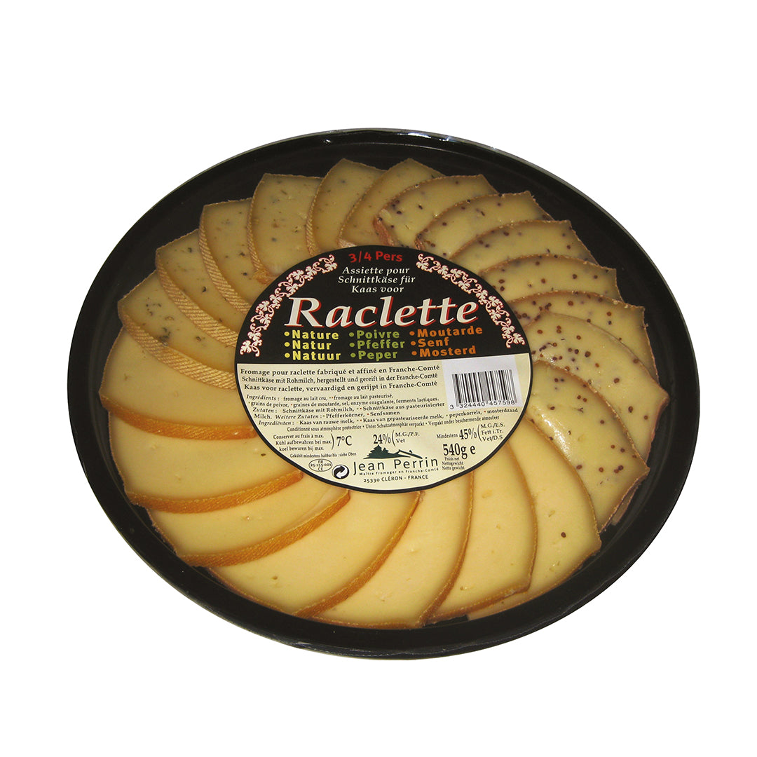 A playful trio of Raclette cheeses: plain, pepper, and mustard; crafted for melting perfection. Each offers a creamy, full-bodied melt with distinct aromatic twists.